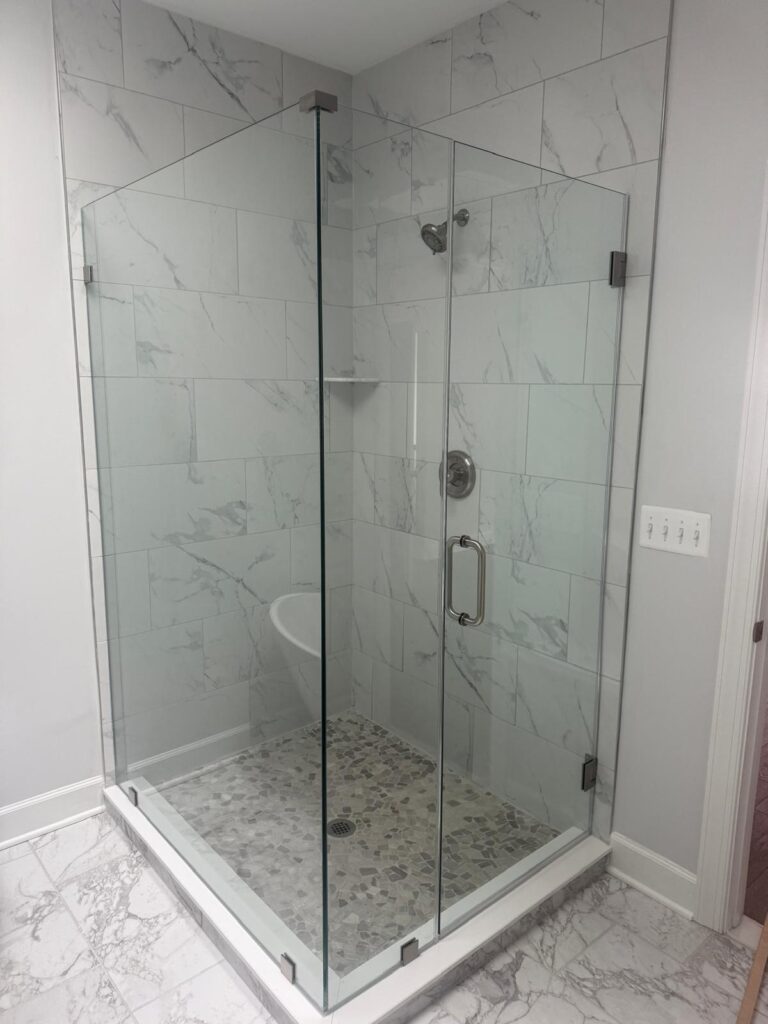 Each installation uses heavy tempered glass (3/8” or 1/2”), premium hinges and handles, and precise alignment for long-lasting performance.